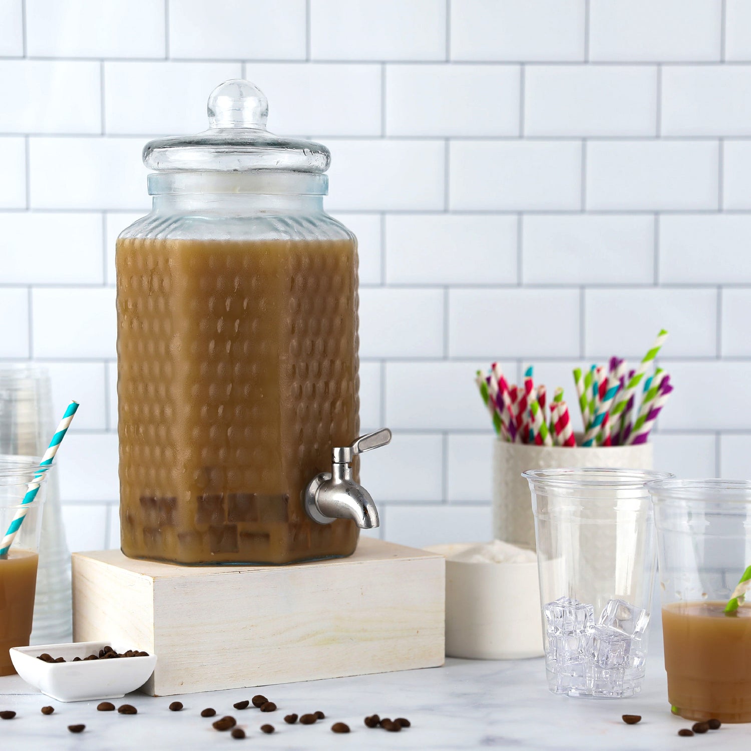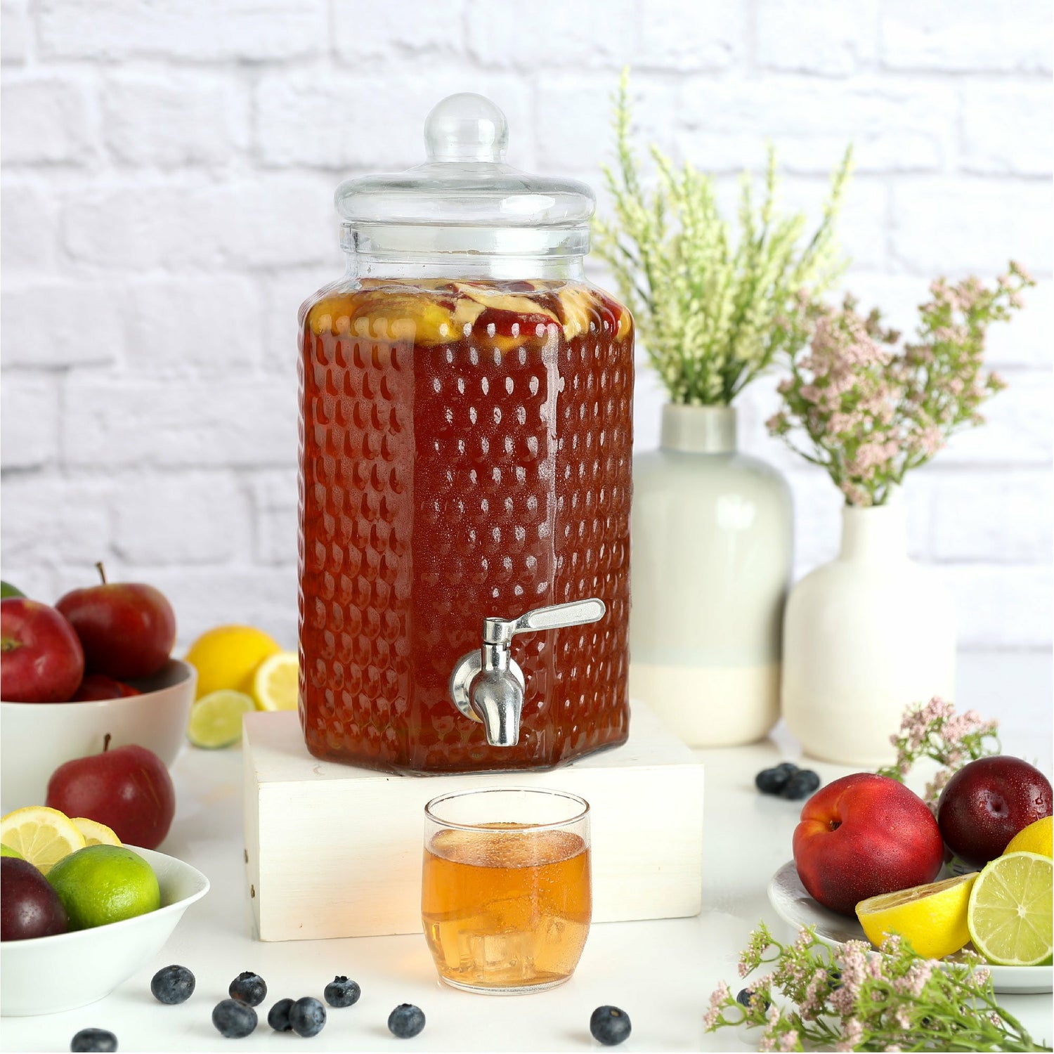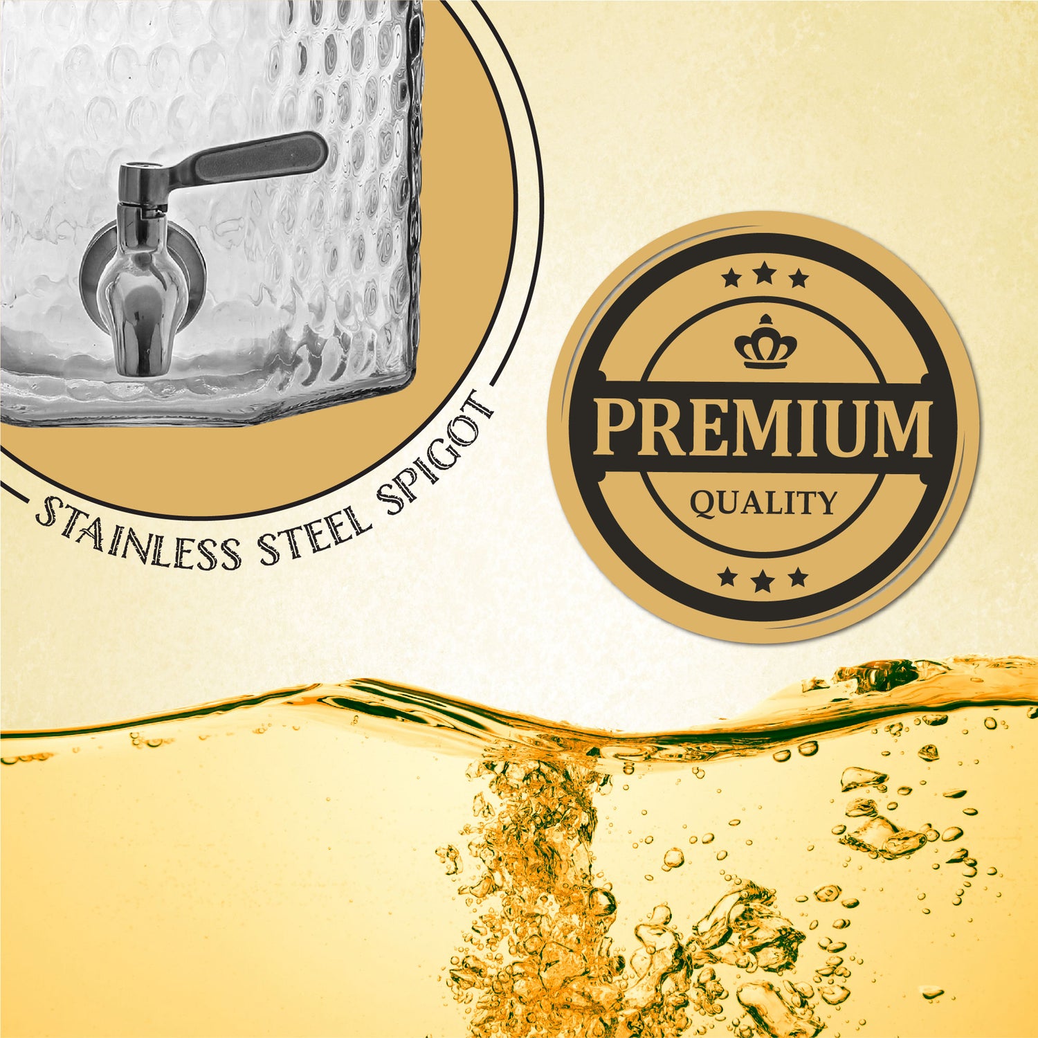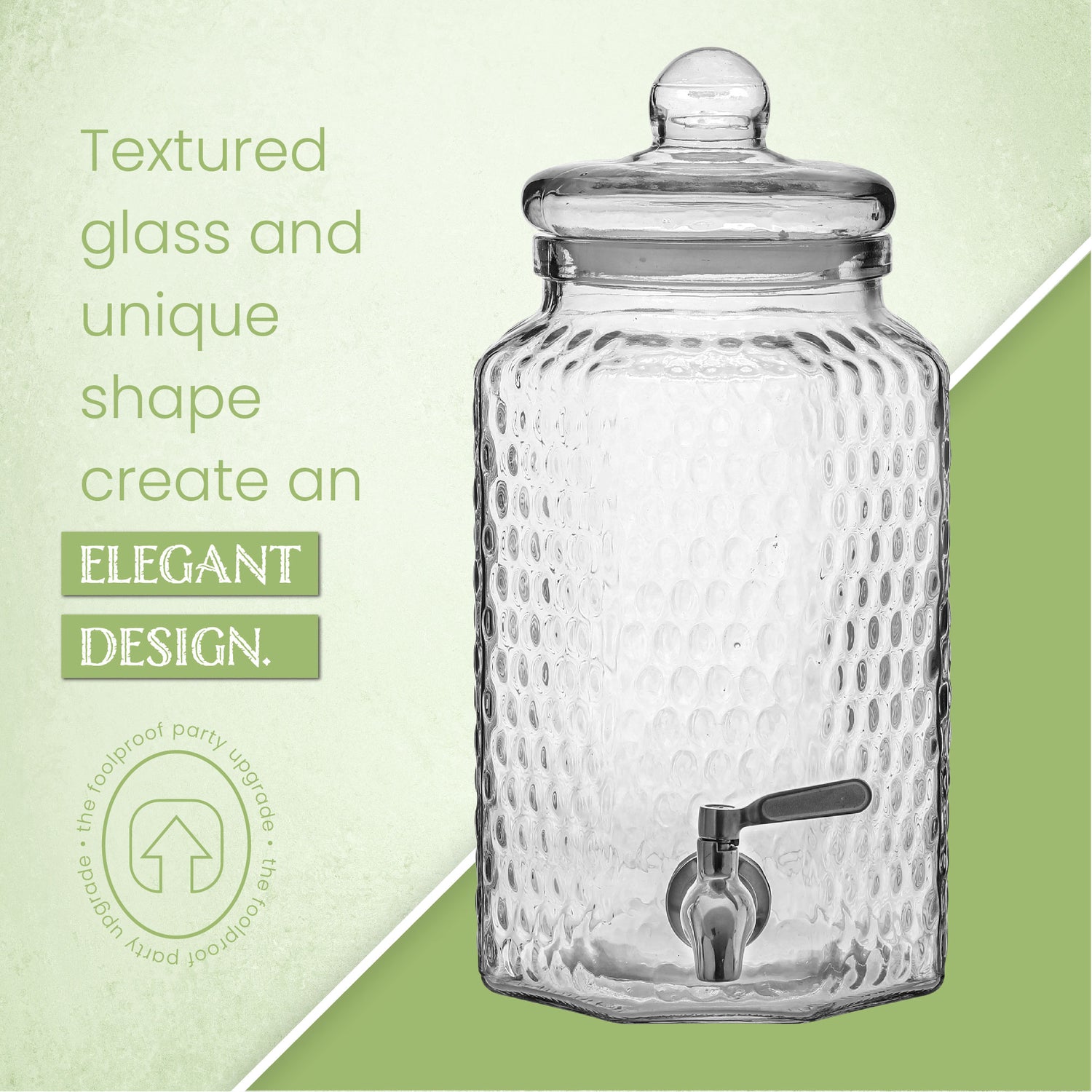 Elevate your event with the 1 Gallon Glass Beverage Dispenser with Stainless Steel Spigot - Hammered Glass. Discover the perfect blend of durability and style, and redefine your beverage presentation today.