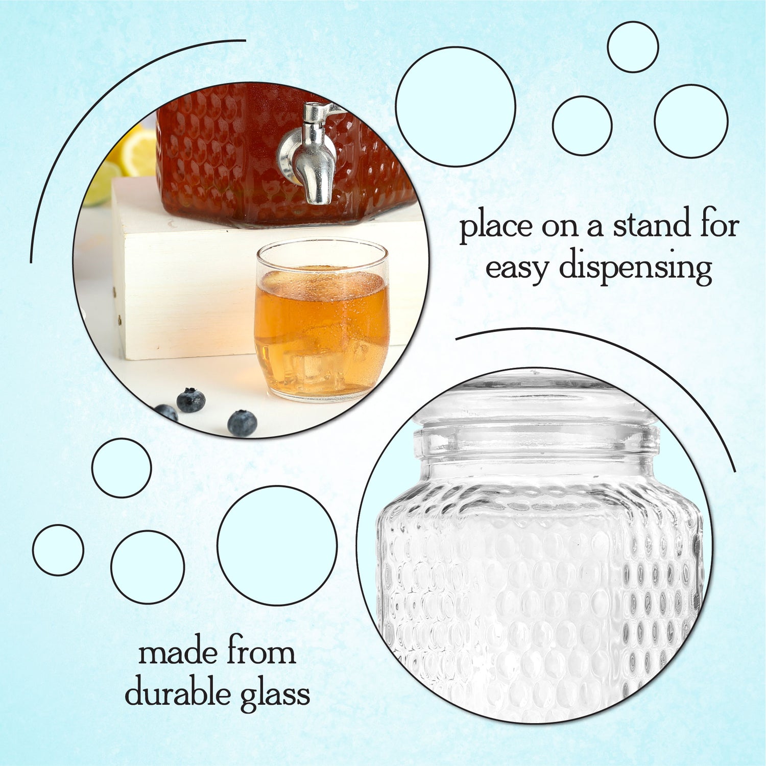 Built to endure countless uses, our dispenser features a thick glass construction that's as durable as it is elegant. Its durability is matched only by its aesthetic appeal, making it a functional centerpiece for any occasion.