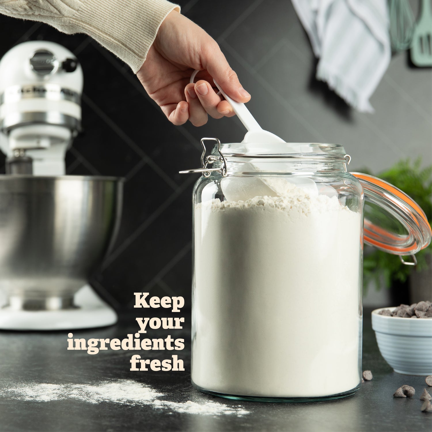 - Stylish and Practical: Not only do these glass jars excel in functionality, but they also add a touch of elegance to your kitchen decor. Enhance the aesthetic appeal of your cabinets, pantry, or countertops while keeping your food items and ingredients fresh. The airtight lids effectively seal in freshness and prevent waste.