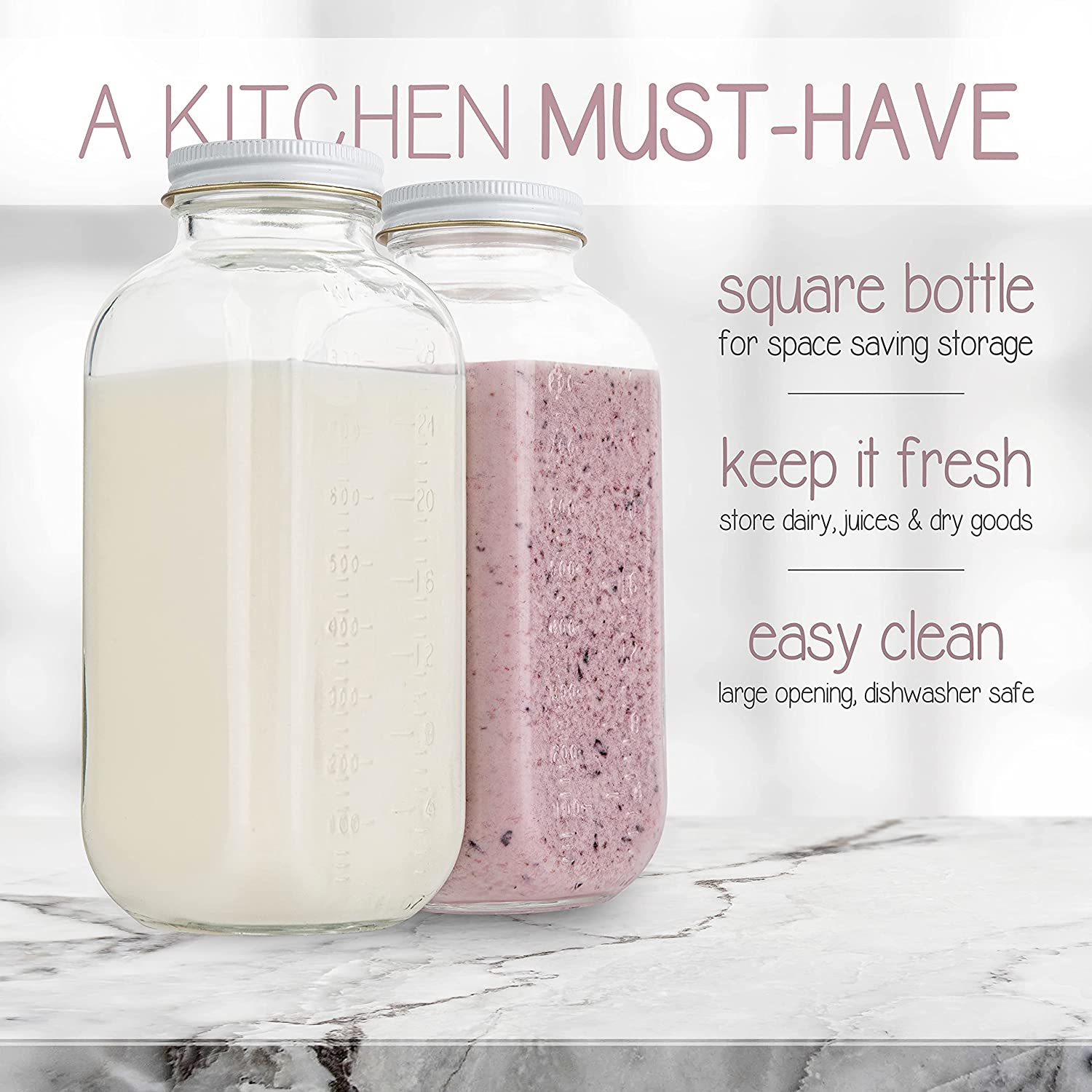 Elevate your storage solutions with our 32oz Square Glass Milk Bottle, equipped with durable metal airtight lids. At Kitchentoolz, we prioritize quality and convenience to enhance your everyday experience.