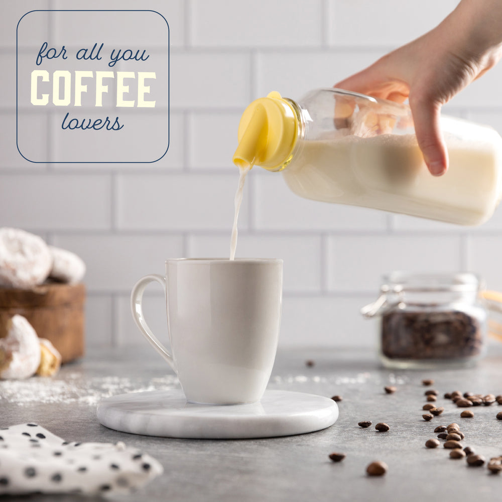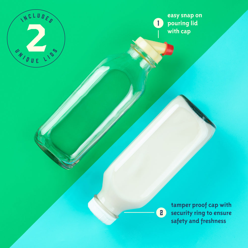 - Includes 2 Unique Lids: Seal in the freshness of your milk with a tamper-proof cap featuring a security ring for added safety. Additionally, enjoy the convenience of an easy snap-on pouring lid with an end cap for mess-free pouring during meal prep or at the kitchen table.