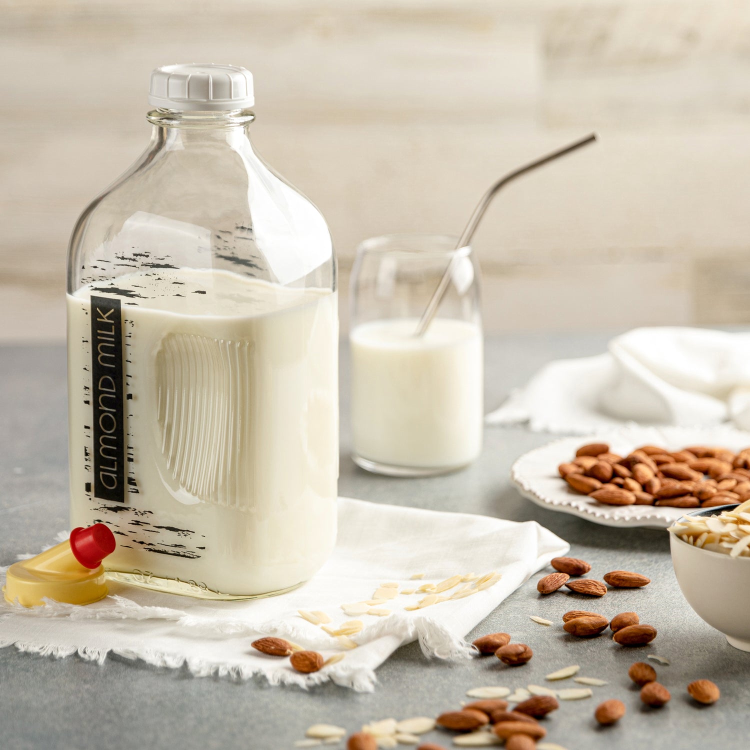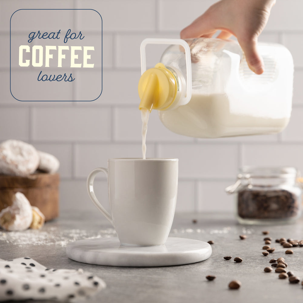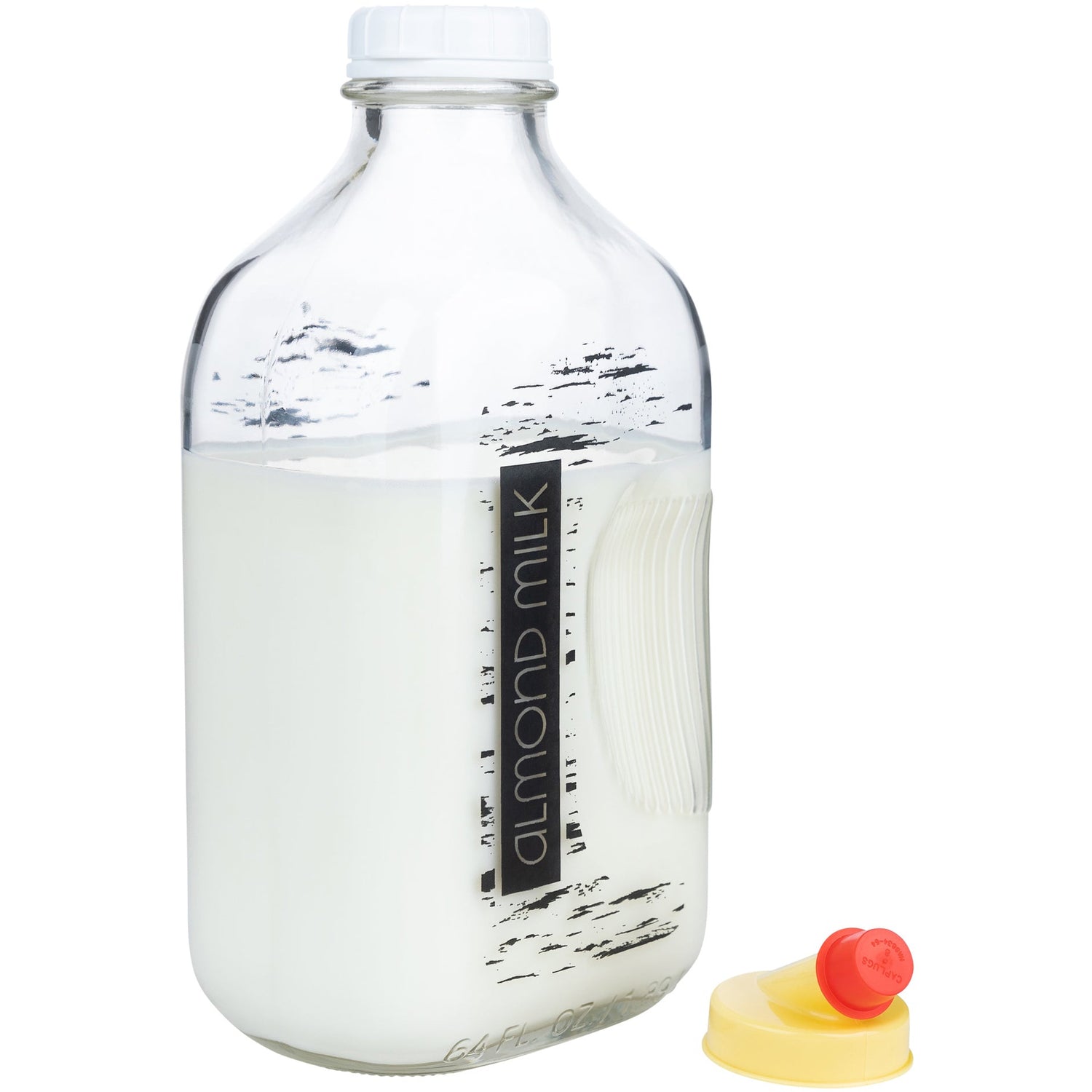 - INCLUDES 2 UNIQUE LIDS: Seal your precious milk with a tamper-proof cap with a security ring to ensure safety and freshness. Also included is an easy snap-on pouring lid with an end cap so you can pour your milk easily during meal prep time or at the kitchen table.